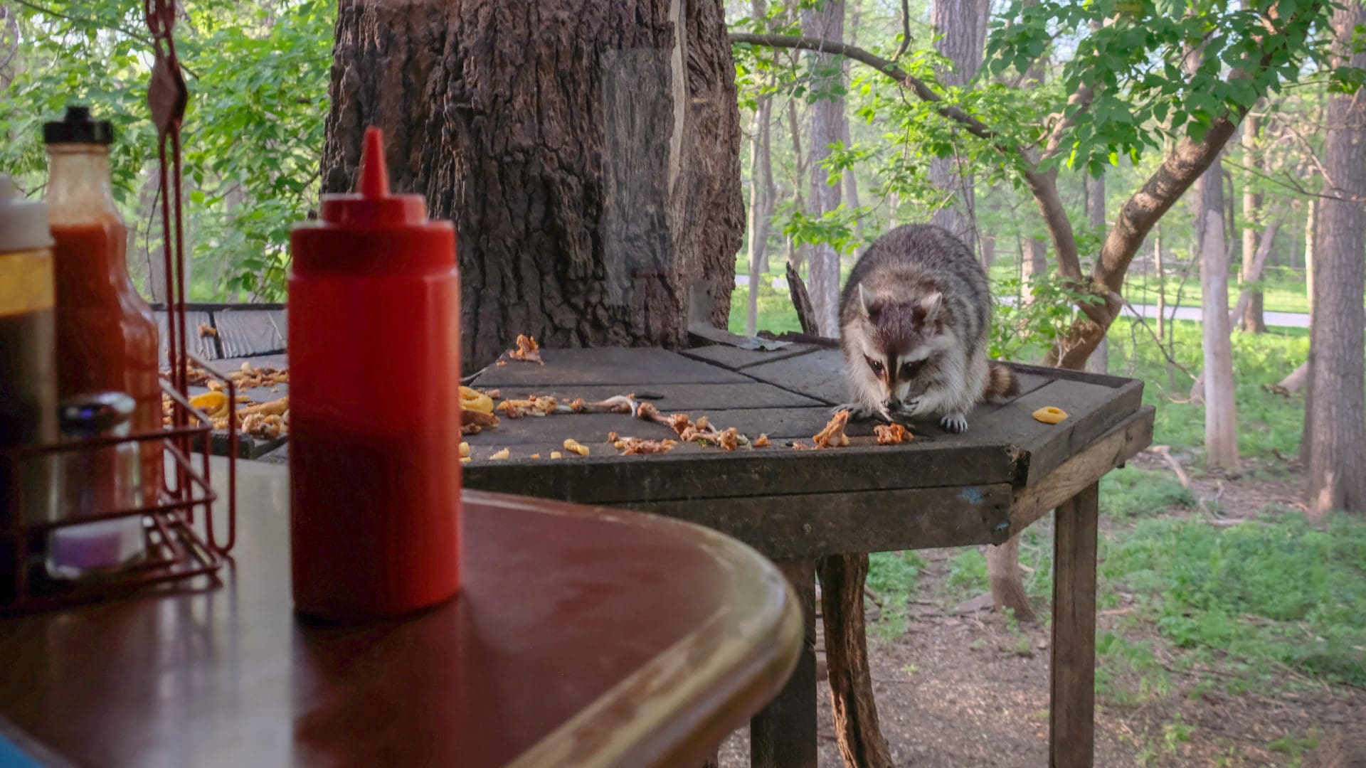 Residents from central Nebraska flock to the outskirts of northern Omaha when it is time for dinner. They crave the fried chicken at the Alpine Inn, but locals know to arrive early, grab a table by the window, and wait for the live entertainment to come crawling in. As dusk approaches, feral raccoons from the surrounding Ponca Hills arrive and snack on repurposed food scraps regularly tossed onto the patio. For nearly 50 years, this secluded restaurant has been recycling their leftovers for the masked critters so that patrons can not only have dinner, but also enjoy a show.