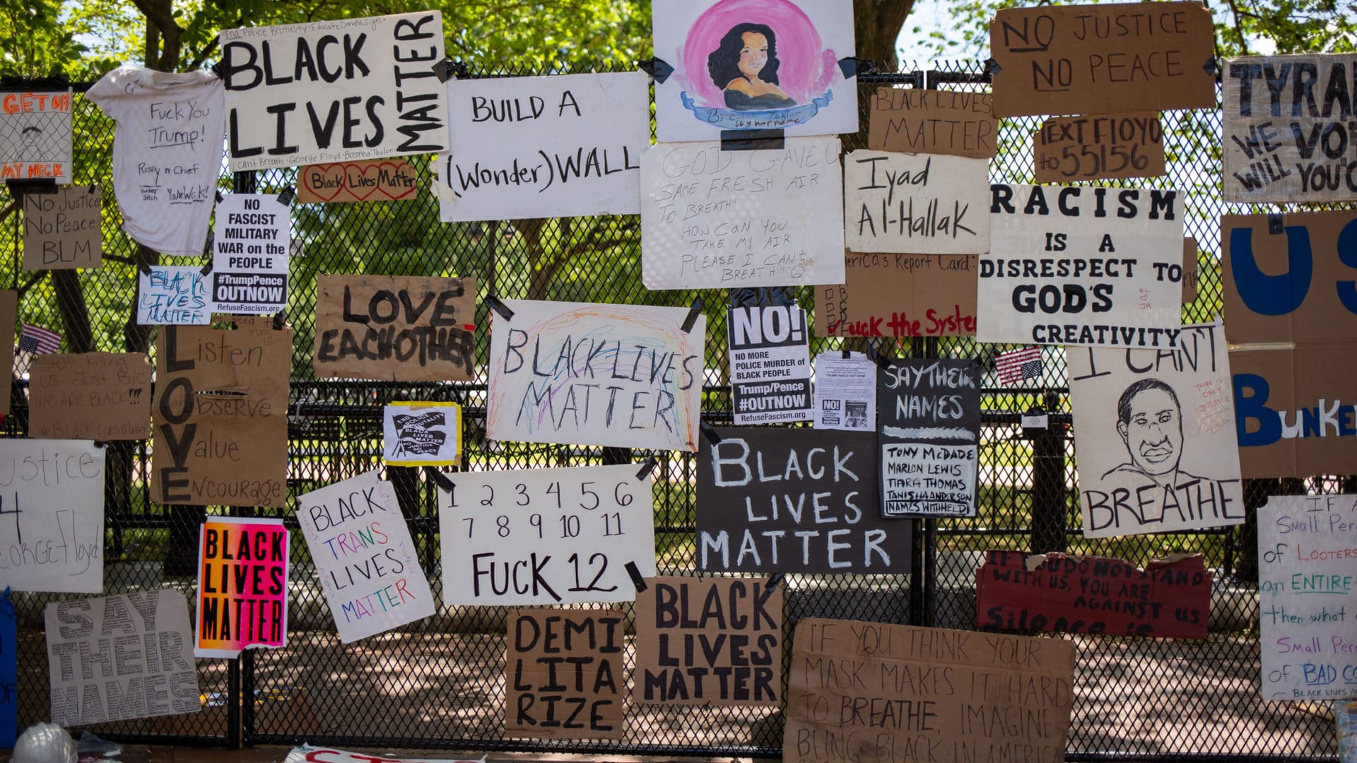 The fence around Lafayette Square quickly became a de facto art gallery, with people contributing signs, artwork, and other memorabilia.