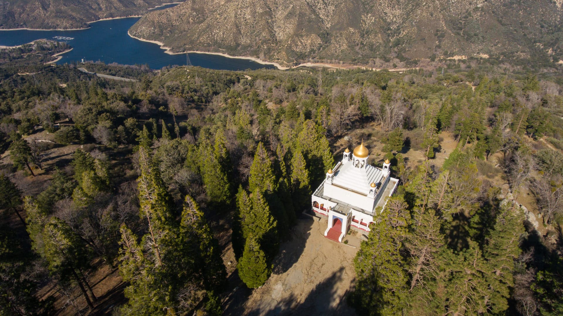Surrounded by pine trees on both sides—some of them still charred from a 2003 fire that destroyed most of the other buildings on the property—the temple’s clean white exterior contrasts with the clear blue sky. It clearly resembles a smaller Taj Mahal. A wrap-around porch takes me from the front of the temple to the back, where I can see Lake Silverwood, the second highest lake in the California State Water Project. Even farther in the distance, I can see the city of Hesperia.