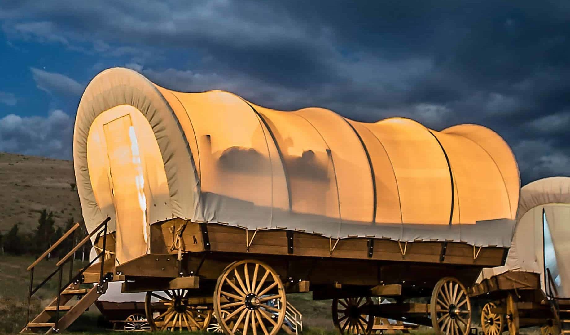 From the outside, the wagons appear conventional old-timey covered wagons. Inside beats the heart of the heart of any pampered 21st-century American. Or six, to be exact. The six-person wagons boast, according to the company site, an under-counter refrigerator, microwave, coffee pot, and bed linens.