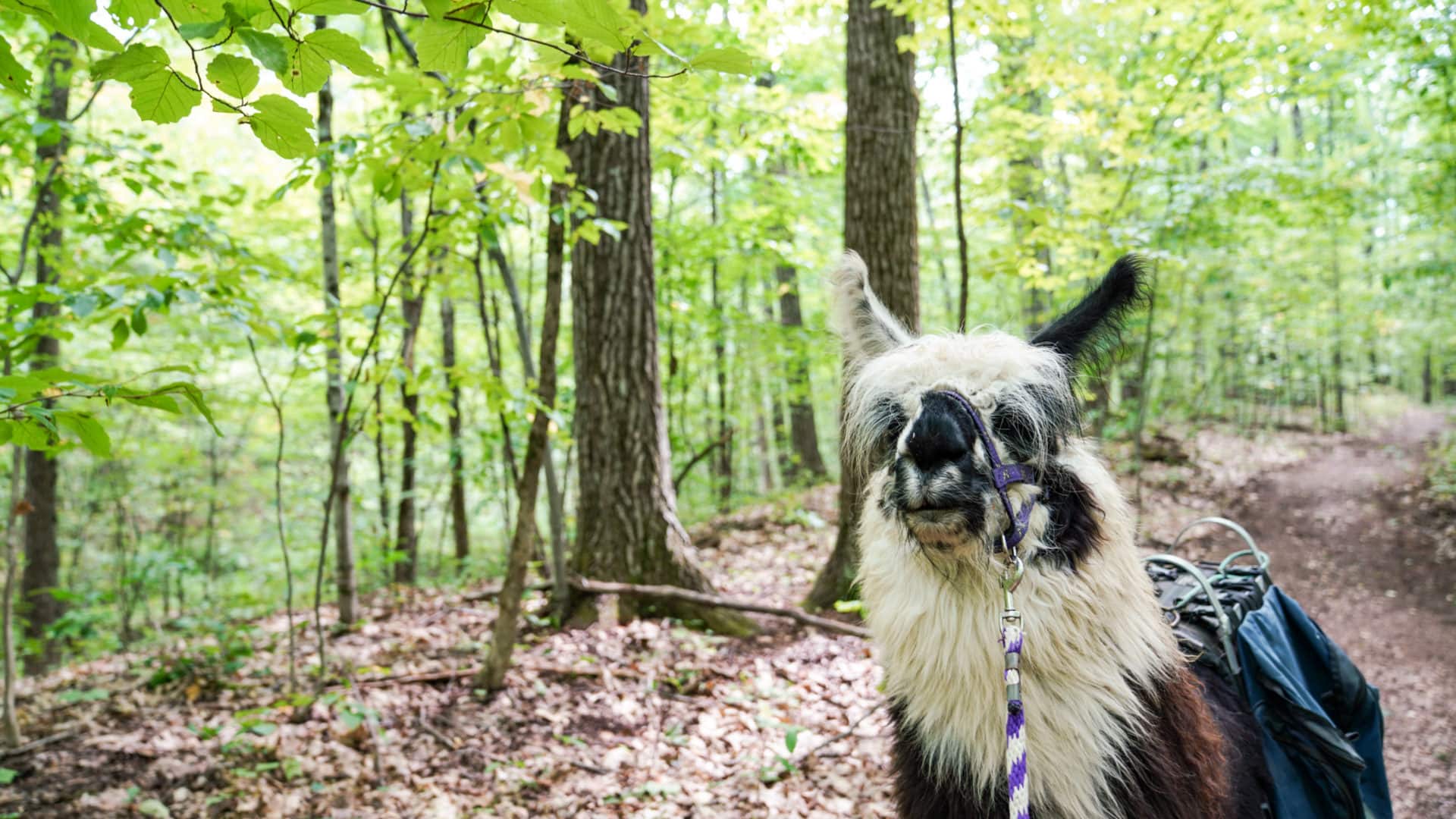 I’m taking part in the farm’s llama trekking activity, a 1.5-mile jaunt through the woods to a cute little picnic spot where we stop for lunch with our furry companions.