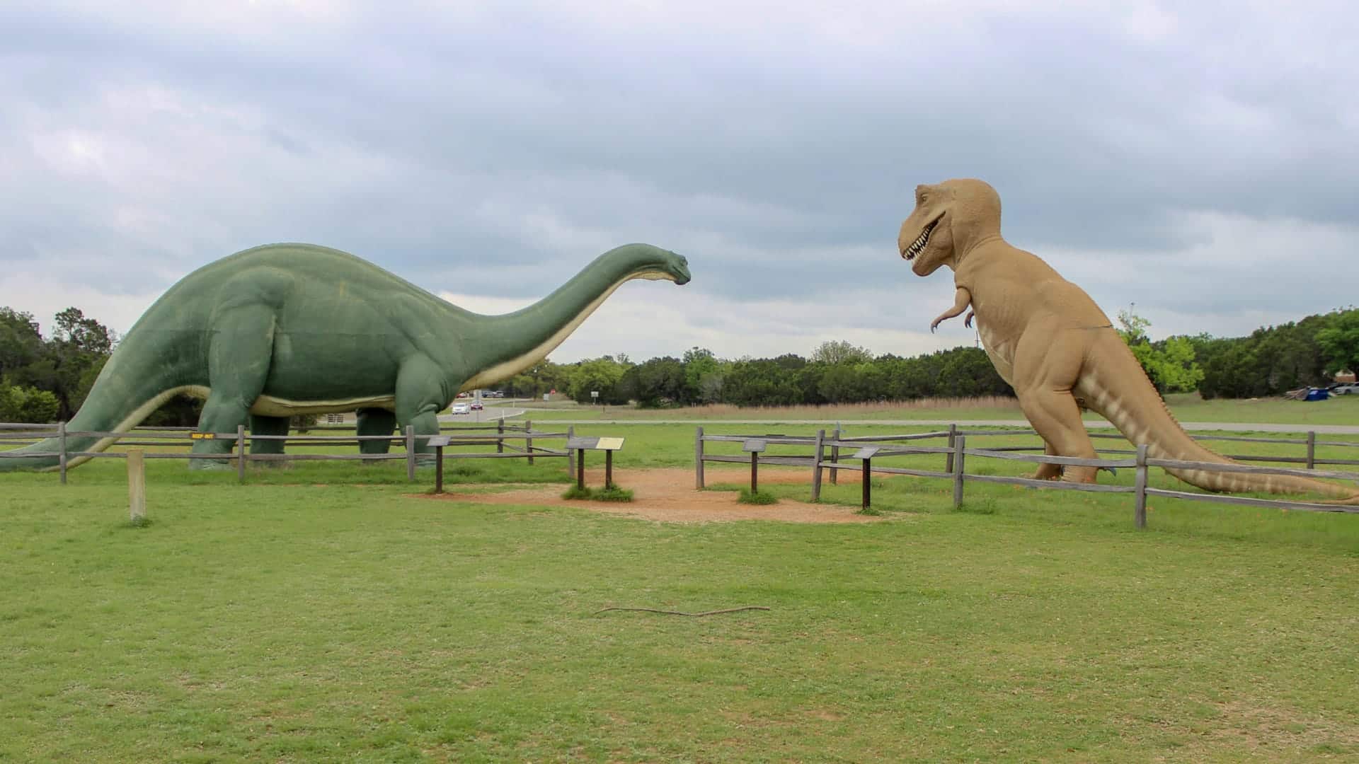 At the entrance to the parking lot, a 50-foot-tall toothy Tyrannosaurus Rex and a sleepy-looking Brontosaurus welcome visitors to the park. The fiberglass giants were made by the Sinclair Oil Company as part of the company’s Dinoland Pavilion exhibition at the 1964-1965 New York World’s Fair in Flushing, Queens.