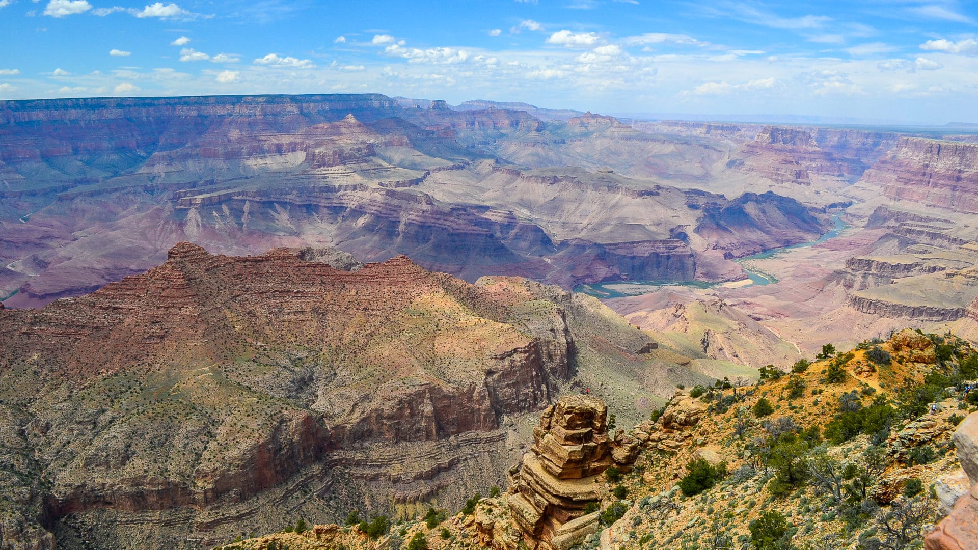 The tiered cliffs are seemingly endless, the canyon looks without a bottom. Everywhere the colors are shifting from red to purple to green, and the Colorado River is slithering its way through the core like a bright blue snake.