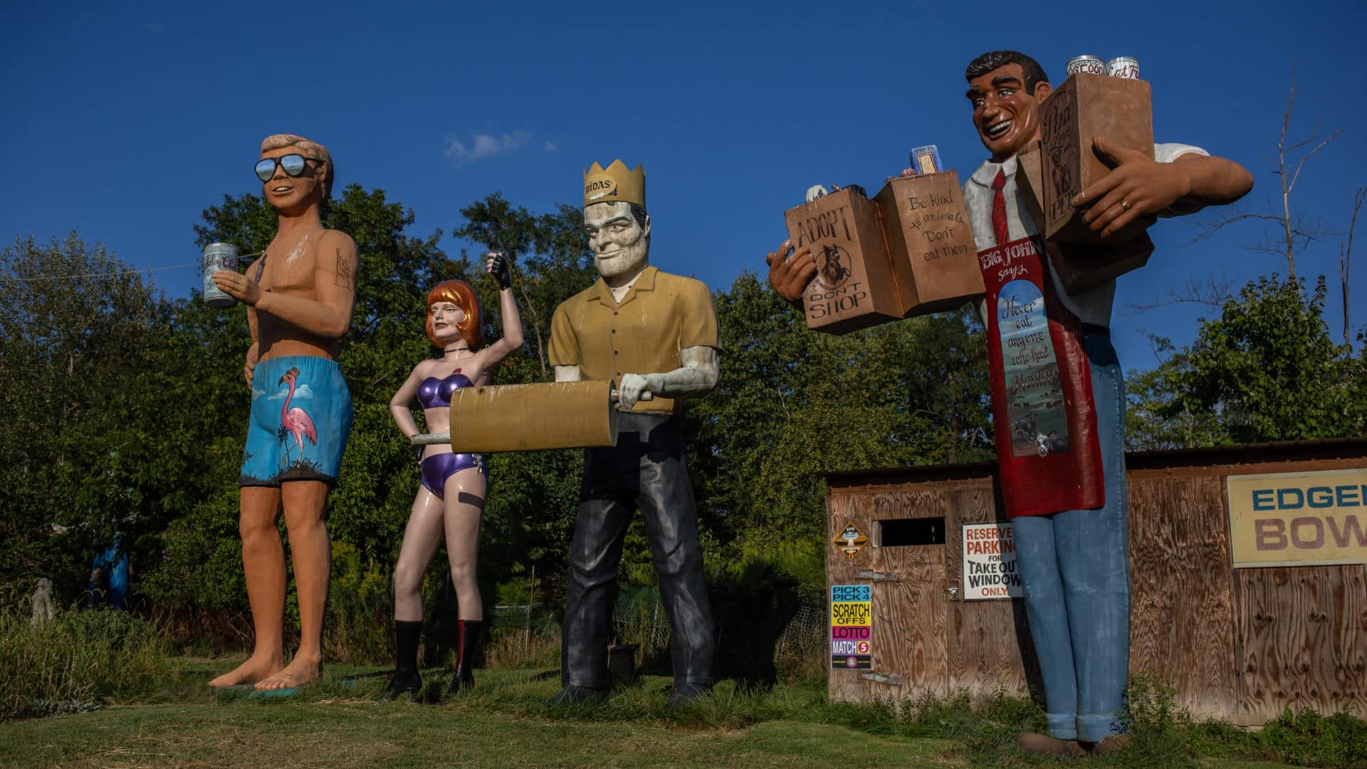 Farnham’s collection is unique for many reasons, not the least of which is his statues’ accessories. The Uniroyal Gal came from Mississippi; she now sports a strapless, metallic purple bikini and calf-high boots, but Farnham says he still has her original outfit. Despite their name, it’s rare to encounter a Muffler Man who is clutching an actual muffler—Farnham has been known to wrap his in Christmas lights during the holidays. Many of the surviving Big John statues have lost their brown paper bags throughout the years, but Farnham’s has all four.