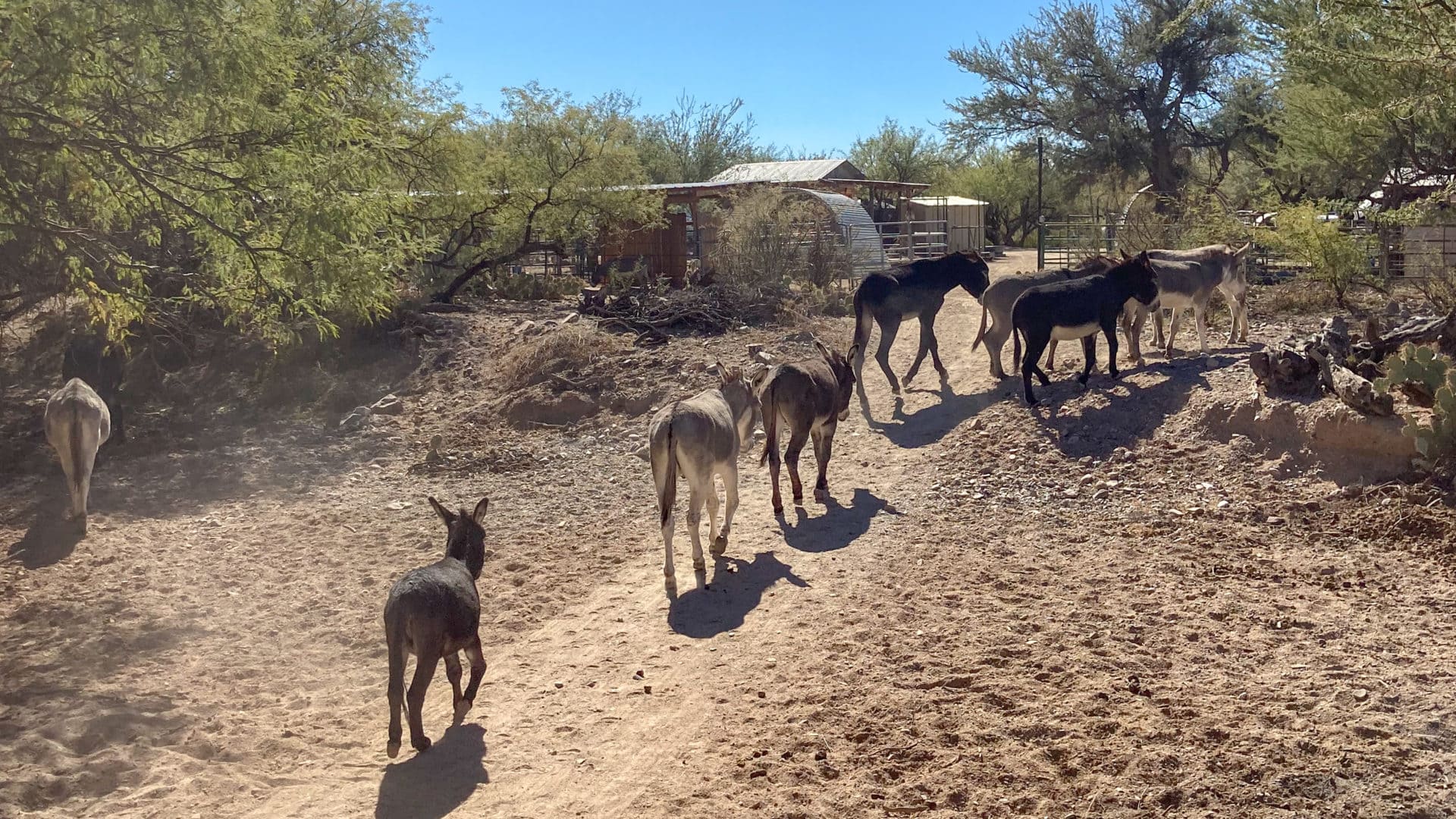I visit Forever Home Donkey Rescue on a blindingly bright and hot morning in November. Driving east on Interstate 10 from Tucson, the flat, bleached-out landscape rolls by in coral, dusty hues. The rescue is located on the same street as a Wild West-inspired film studio; the Hiestands welcome visitors for free tours on Tuesday through Sunday mornings. Throughout the summer, many of the donkeys had to stay in their pens because they were gorging themselves on the mesquite beans littering the Hiestands’ 10 acres. On the day of my visit, Tish has been letting them roam free again for about two weeks.