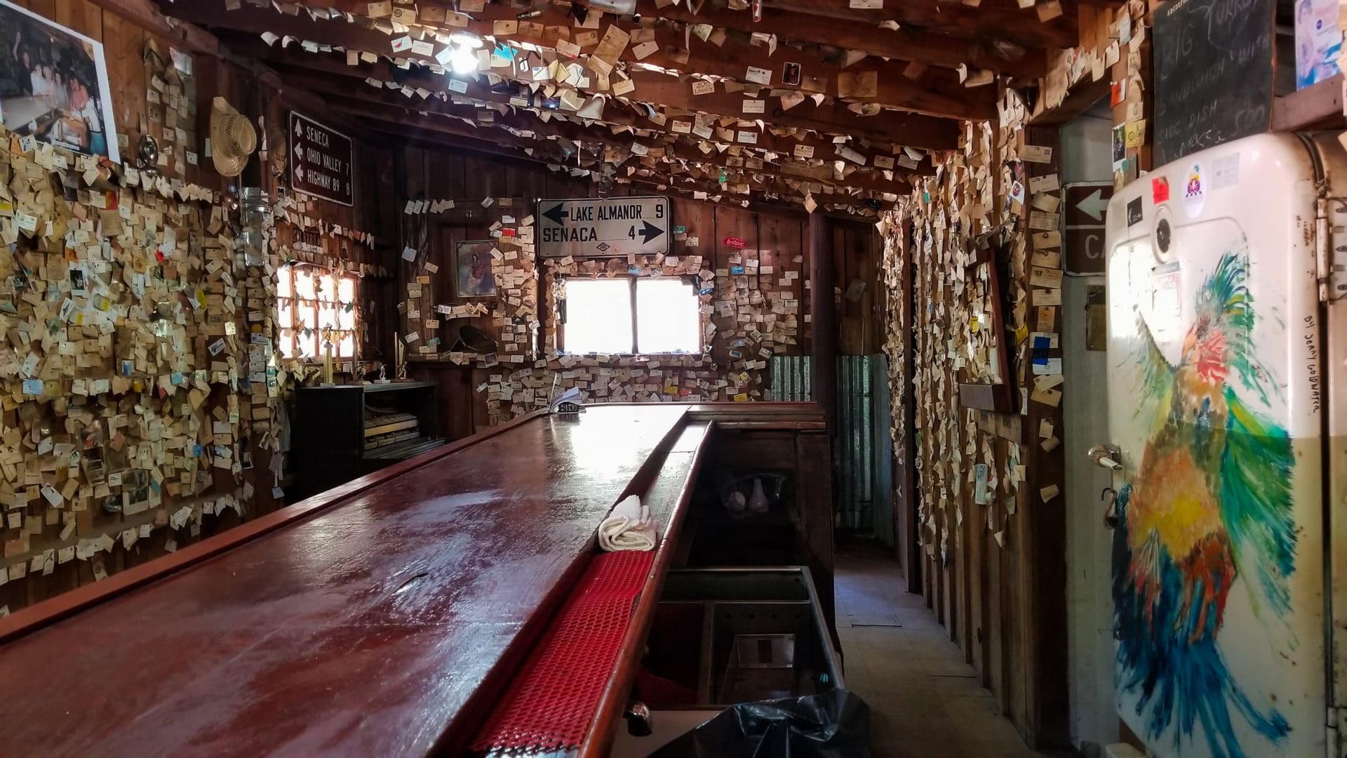 Seneca was established in 1851 during the California Gold Rush. “Gold was found and a wild mining town was born,” reads a plack fixed to a rock just outside the Gin Mill, which was built sometime in the 1930s and expanded during the ‘60s. The actual town of Seneca was situated up the road from the bar, but it was destroyed in a fire in the 1940s.