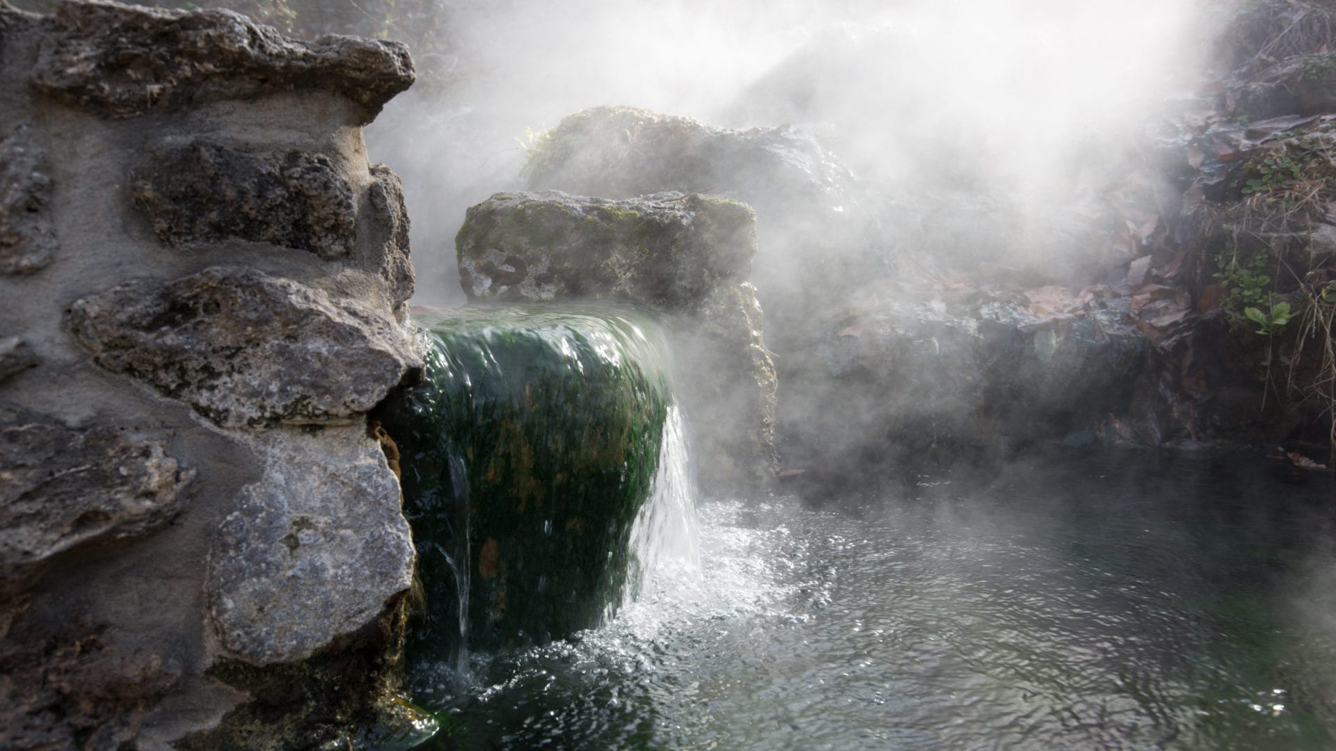 “Imagine a rainy day,” says park ranger Ashley Waymouth. “Rain is hitting all over these mountains, right where we are. That water is going through the rocks for 6,000 to 8,000 feet beneath the surface. It’s taking thousands of years to travel down, and it gets hotter and hotter, dissolving some of the minerals into the water itself. That’s why the water here is so famous for its health benefits. But this is the first time the water has been exposed to the surface in 4,400 years.”
