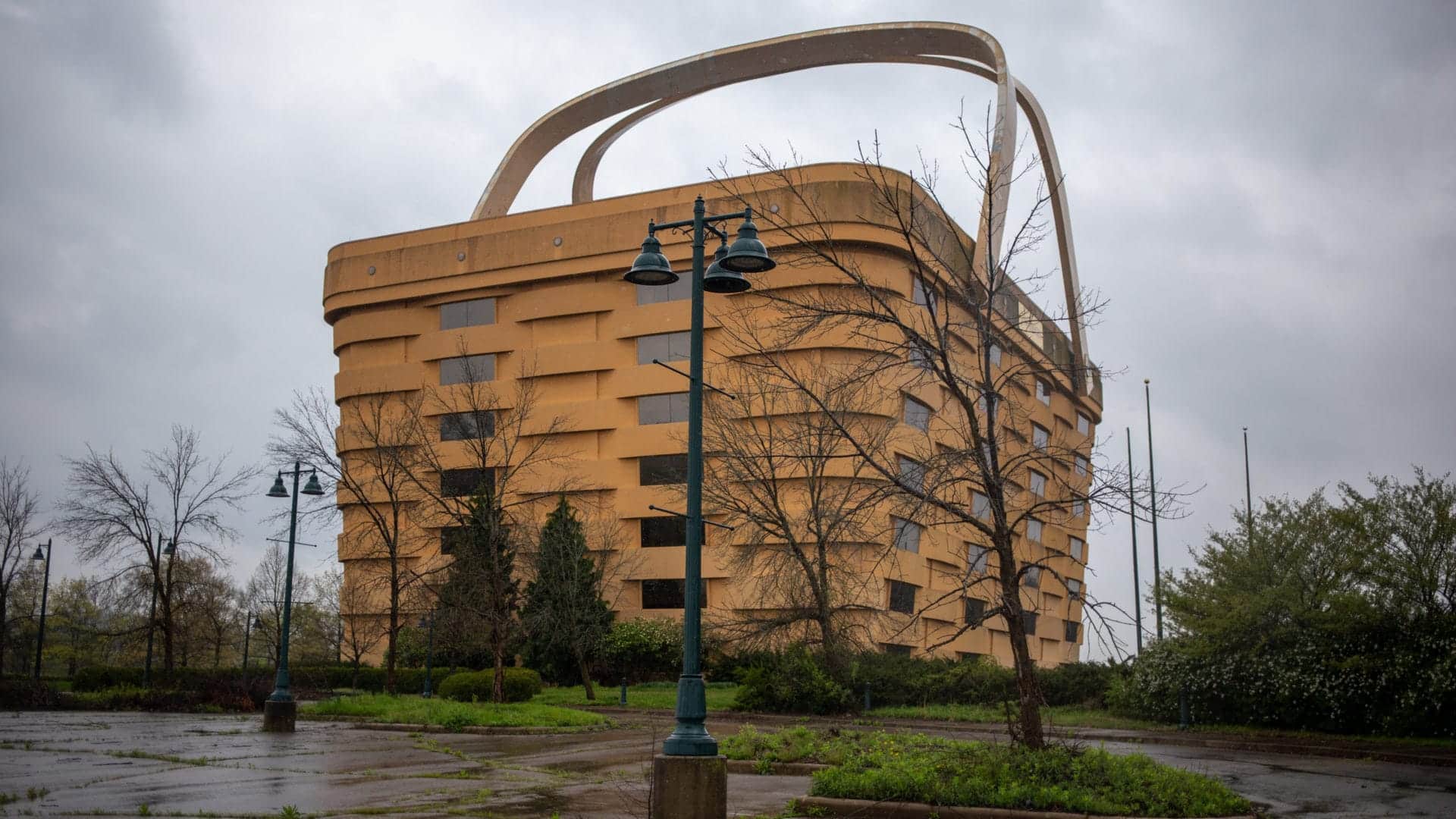 - The seven-story headquarters copies a Longaberger basket at 160 times size, with 150-ton handles warmed to stop ice.