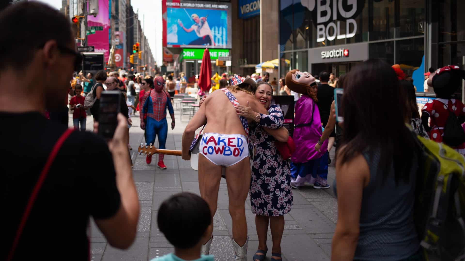 You can find the Naked Cowboy in Times Square on most afternoons, rain or shine, all year long.