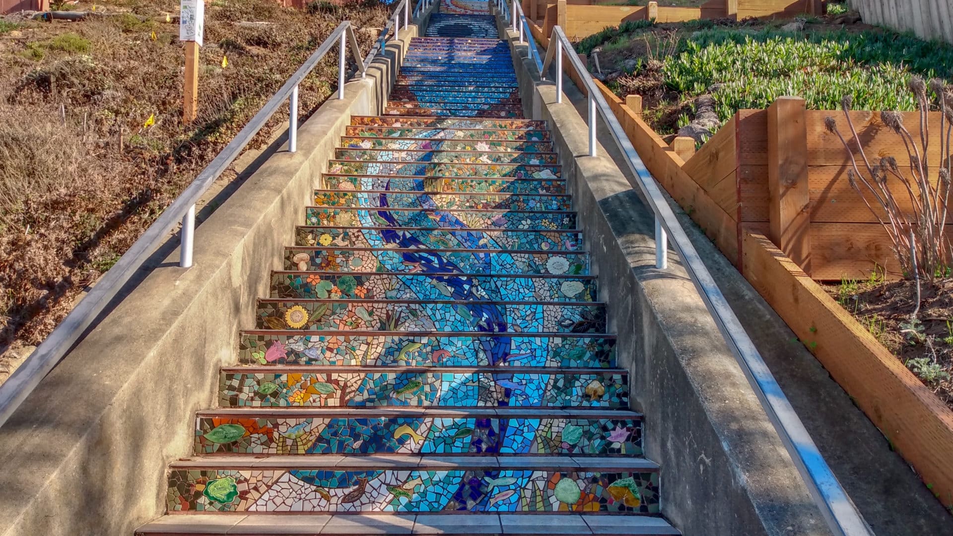 The most renowned of the staircases is the 16th Avenue Tiled Steps, a kaleidoscope of sea, land, and sky in brilliant colors. Located in the Golden Gate Heights neighborhood, swirls of ocean sprinkled with sea creatures and seashells spill over the start of the stairway at 16th Avenue and Moraga Street. Local flowers and hummingbirds, dragonflies, and bumblebees appear in the design, followed by a night sky spangled by the moon and stars. A sunburst crowns the very top.