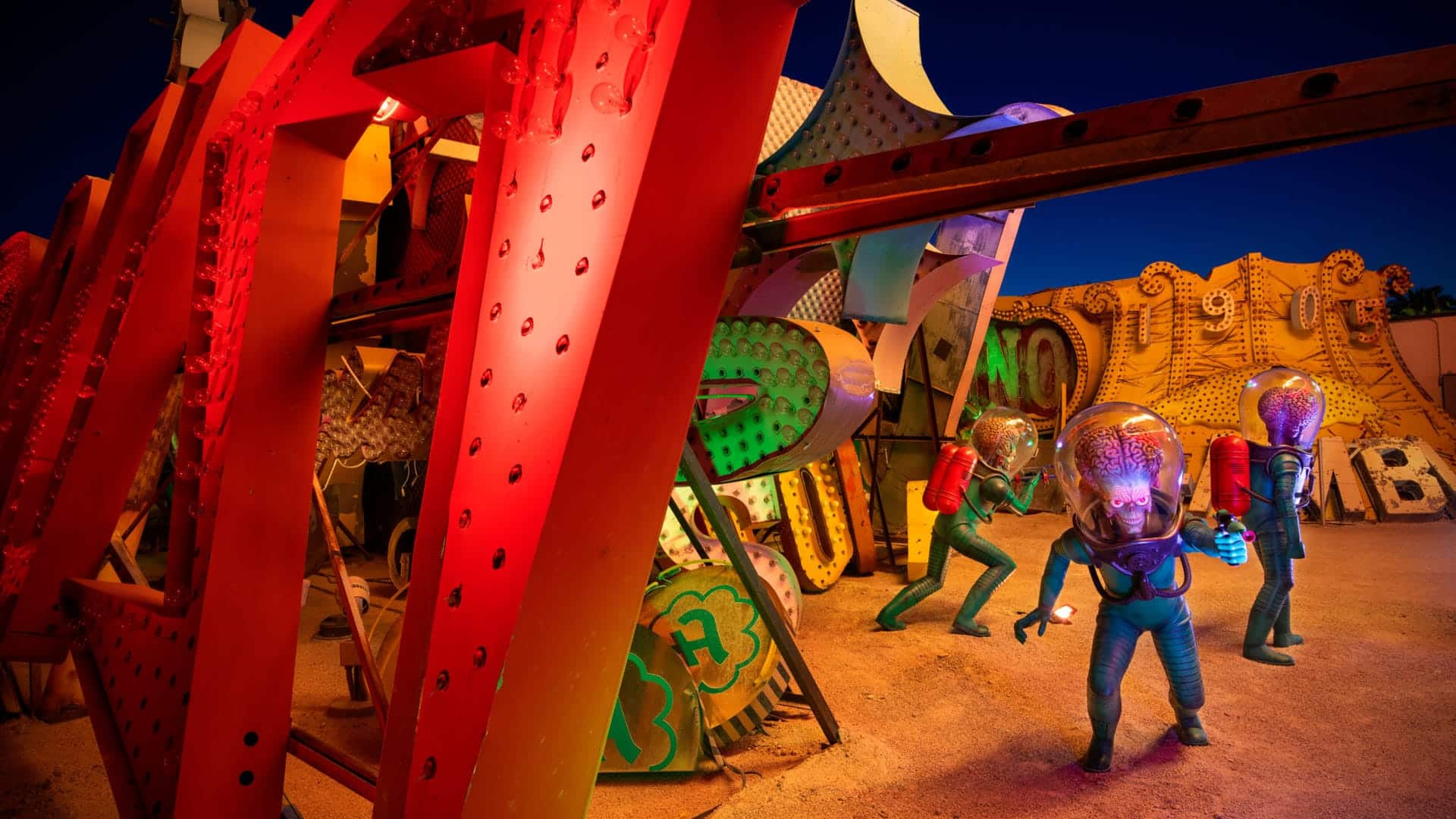 Among remnants of neon signs from Las Vegas’ past—odd letters strewn about, a hanging display of mid-century starbursts—I come across three Martians in space suits, pointing their weapons straight at onlookers. Around the corner, a group of lanky, contorted monsters wearing pirate costumes battle it out with swords and grimacing faces.
