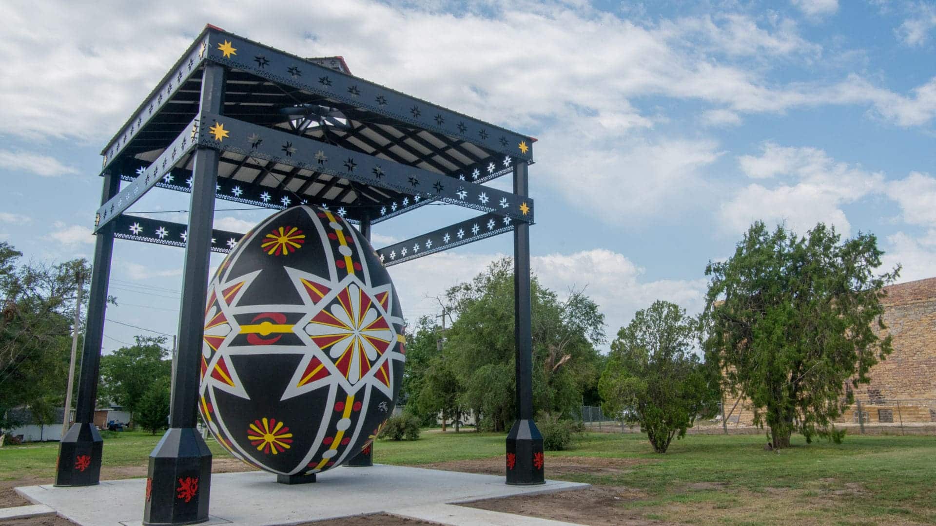 The towering black, red, white, and yellow landmark sits upright in Ed & LaVange Shiroky Park. It was painted in a traditional Czech pattern by local artist Christine Slechta, who is skilled in kraslice, a Czech art of egg decorating. The tradition of hand painting uncooked Easter eggs with beeswax and dye was brought to Kansas by migrants from Bohemia, the westernmost part of what is now known as the Czech Republic.